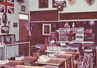 Let's have a short run-down of a few of the items each building contains; The Glass House houses a collection of glassware from cup glass to Depression glass; china - from Ironstone (remember the large white soup plates you ate your hot porridge from each morning?) to fine English and European china; lamps - many models and sizes, including a beautiful hanging lamp complete with hand-painted shade and crystal drops; bathroom sets (mostly missing the mug that went under the bed, guess it got the most practical use); gramophones with both cylinder and 1/4 inch thick discs; stereoscopes and cards; and photograph and postcard albums. Our lady visitors seem to like the Glass House more than the other buildings. ![]() ![]() The Library & Smoke Shop Next in line is the library and Smoke shop. Here we have modem books as well as old, dog-eared volumes. Our oldest book is a huge Bible with an inscription on the cover showing it was given as a gift in 1756. It is written in the German language. Here also is a conglomerate of newspapers, news-magazines, farm journals, and craft magazines. There is a "Grain Growers Guide", September 10th, 1919, Volume XII, No. 37, publjshed weekly with George F. Chipnan, Editor and Manager, which has a page of Arch Dale's "Doo Dads". There is also "True Story" magazine, October; 1925, Volume XIII, No. 3, published monthly by True Story Publishing Company, New York, New York. It has proven to be a real eye-catcher. There's many a gal who remembers avidly reading "True Story" and hiding it quickly under a pillow when Mom and Dad approached. The Smoke Shop consists of tins, cans, and humidors that once contained that evil weed called tobacco. One tin has the price ten cents stamped on it. Imagine! ![]() Also displayed here are articles pertaining to tobacco - pipes, tobacco cutters, cigar lighter and other numerous articles. A guest book in this building shows visitors' names from many places in Canada, Great Britain, and the United States. The General Store Let's move on to the General Store, On the way we pass a C. P. R. baggage wagon on which proudly stands a large brass school bell purchased at Gainsborough, Saskatchewan; as well as a feed cooker or pig scalder and a wooden-wheeled child's wagon. Outside the store, a hand-wound barber pole is placed on the wall. Inside are many articles that were found in most country stores, haberdashery shops, and hardware stores. There is also a wooden apple-barrel from Ontario with a checkerboard tacked on the lid, as well as a "Whatzit". What it is, is a large, cumbersome butter roller standing on 24 inch legs, It was put out by the T. Eaton Company about 1917. There is, of course, a large pot-bellied stove in the General Store. ![]() Robinville School Now we are going to Robinville School which is the former country school in our neighbouring district. In here we have a varied collection of sealers such as Beaver, Canadian Queen, Doolittle, and Mason, as well as bottles. It's a real find to come across an embossed bottle bearing the name and address of a chemist or druggist, or an old pop bottle whose manufacturer has long been outof existence, a Raleigh's peddler's carrying case of 1921 with many full bottles and tins, sits on a table. Besides it is an electric refrigerator with the cooling unit on the outside on top of the refrigerator. Shelves inside the classroom are lined with old and new school books such as a sot of Canadian Readers, published by Gage and Company, Toronto, dating from 1881 to 1883, and a set of Victorian Readers, published by Copp, Clark Company and W.G, Gage Company Limited, Toronto, dated 1898, There are also map cases, chalk boxes, slates and slate pencils, and four heavy ledgers containing accounts of Christie's School Supply Limited, Brandon, Manitoba. These ledgers show the company dealings with schools all over Western Canada and Ontario. These are accounts of the years 1910 to 1916. We had hoped to set this building up as an old-time classroom, however, because it is a fairly large building and our collection is also fairly large, the additional space was used to display radios, cameras, harnesses, Indian artifacts, and war-time mementos. ![]() Pendennis Station From Robinville we walk to Pendennis Station. This contains railroad lanterns, brochures for travelling by rail or steamer, mail sacks and locks, and a long pole with a hoop on one end used to pick up messages without stopping the train. Here also we see a large collection of wrenches. Many an old-timer reminisces here while: displaying a badly- bent finger or a hand missing a finger and pointing to the wrench that did it to him. Also on display are license plates (still with one or two missing to complete the set), tools, keys, washing machines and a string of brass harness bells, each one with its own distinctive ring and tone. ![]()