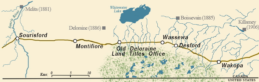 ![]() Introduction | The Assiniboine | The Souris | The Little Saskatchewan | The Boundary Trail | Here & There The Boundary Trail The Oldest Highway in the West The Boundary Commission trail was the route taken by the Boundary Commission in 1873 & 74 as they surveyed the Canada – US Border. They bridged creeks, established crossings, and cleared bush as necessary; but the general route they followed spans centuries, crosses cultural lines, and involves a multitude of goals and purposes. Although one short period of its life at the dawn of European settlement gave the trail its name, it was well travelled long before that time. Parts of it began as a First Nations travel and trading route, which the fur traders of the 18th Century naturally used when they began penetrating the interior of Rupert's Land as the region was then called. Not too long afterwards, the Red River carts of the Métis wore grooves into the prairie sod of the trail in their pursuit of the bison as the large animals retreated ever westward. Many of the pioneers of European origin who came to take up homesteads in the southwestern corner of Manitoba in the 1880’s came from Ontario. One popular route was via boat to Duluth on Lake Superior, then by rail to a point on the Red River directly south of Winnipeg, where they might have a choice between a riverboat or a train to Emerson on the Manitoba - Dakota Territory border. Before the CPR began regular service west from Winnipeg in late 1881, most made their way westward along the Boundary Commission Trail, often in wagons drawn by oxen or horses, with whatever belongings and supplies they owned. It was a long, slow, journey, but the trail first blazed by the Boundary Commission in 1873 was well travelled, and several “Stopping Houses”, pioneer versions of the roadside motel, had been established in farm houses along the trail. If the weather cooperated, and the wagon didn’t lose a wheel or break an axle, it might well have been almost an enjoyable trip. The Boundary Commission Trail in western Manitoba. (Vantage Points Collection – TMSPHA) River crossing could be tricky, depending on the time of year and the water levels. Fortunately, the Boundary Commission, following the lead of Aboriginal hunters and Metis traders, selected advantageous locations for crossing streams. As technology marched on, new routes were drawn, first for trains, then for cars, and while the Boundary Trail was still useful for local travel for a time, the increased use of cars meant that even local and regional transportation shifted onto to those conveniently provided road allowances that bordered each section of land. Evidence of the old trail faded except in a few places where the ruts were deeply etched into a hillside or valley wall. In Southwest Manitoba the streams that had to be crossed by the pioneers were not raging rivers, but in the springtime some of them could present a challenge Using that evidence and the memories saved in written form by local histories, we will highlight a few of the more obvious examples of a pioneer crossing. A Memory... We set out across the frozen prairie on the Boundary Commission Trail to walk 125 miles west into the wilderness to find a homestead. Mother carried the baby in her arms. Uncle George managed to walk. I carried a big old gun which had been used in the Civil War. Father carried a big stick and pushed hard on the wagon box, saying "You'd been a good many miles behind if I hadn't kept shoving on the tailboard''. Robert Blackwell ![]() ![]() 1. Clearwater - Former Bridge Site. N49.13306, W99.03069 ![]() 2. Badger Creek. - Bridge Site and former ford: N49.10368 W99.32316 ![]() 3. Wakopa: Former ford and bridge site 49.06359. W 99.86393 For more info (pdf) ... |