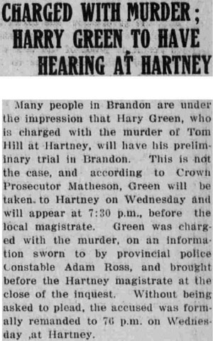 Mr. Green was held in Hartney Jail ; inquest in Hartney in 1914; trial