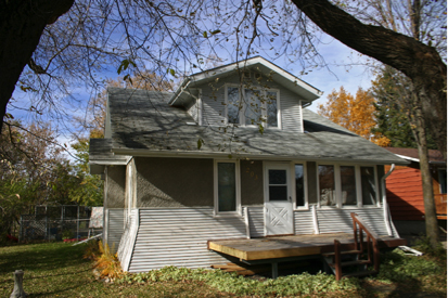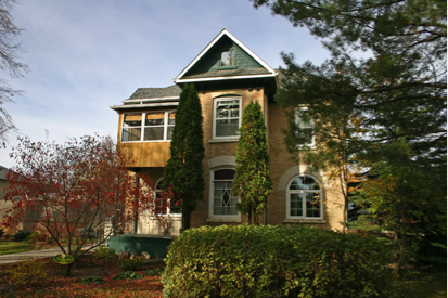 Has a complex roofline, dormers, nice window surrounds and some stained