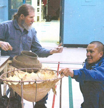 Grant Goltz discussing pottery production with a Band Councillor from O pipin na pipwin Cree Nation (South Indian Lake)