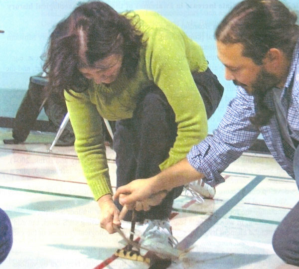 Kevin Brownlee, Curator of Archaeology at the Manitoba Museum, demonstrating making fire to a teacher at O pipin na pipwin Cree Nation at a workshop in 2005. One of Brownlee's names is Poona, meaning fire maker.