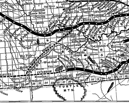 This 1886 map as well shows a proposed railway branch from Brandon to
