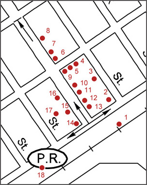 ![]() Melita Site Inventory Map 2: Downtown ![]() 1. Pool Elevator ( 336.D.14) 2. Kennedy Block ( 336.D.16) 3. Livery Stable Building ( 336.D.12) 4. MTS Office ( 336.D.13) 5. Melita-Arthur Telephone Bldg. ( 336.D.5) 6. Crerar Law Office ( 336.D.6) 7. Quick Freeze Building ( 336.D.7) 8. Strand Theatre ( 336.D.8) 9 Former IOOF Hall ( 336.J.2) 10. Barker’s Men’s Wear Building ( 336.D.4) 11. Morrow Pharmacy Building ( 336.D.3) 12. Lefty's Grill ( 336.D.2) 13. Former Northern Bank ( 336.D.1) 14. Former Sturgeon Block Site ( 336.D.9) 15. Melita Bakery (336.D.10) 16. Carels Grocery (336.D.11) 17. Murray's Implements (336.D.17) 18. U.G.G. Elevator ( 336.D.15) |