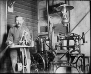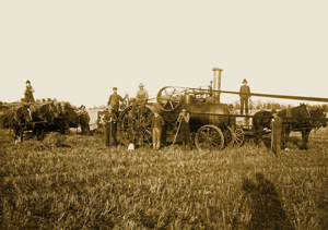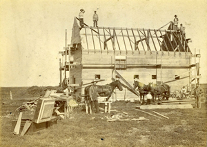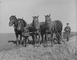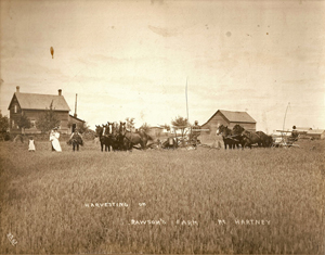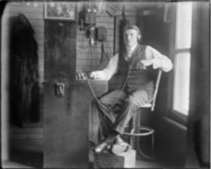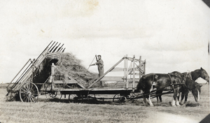 3. At Work Alex Fowler in his Baldur store ![]() Hartney's Victor Duchesneau, and his delivery cart ![]() A harness maker in Lauder. ![]() The first Lauder telephone office Life on the Farm As mentioned, outdoor photography presented special challenges. When the subject is on a farm, distance is also a factor. So it’s no surprise that a majority of the existing photos of a given community are set in town. Such photos that do exist likely also came with a story, now long forgotten. Something brought the photographer to the site. Perhaps it was a request, or perhaps a noteworthy event. In recording the daily lives of resident, the rural photographer was often drawn to harvesting scenes, but other tasks are represented as well. ![]() This photo from the Archives of Canada is a high-quality print of a farmer plowing near Elgin. ![]() This photo is also from the Elgin region. Building a new barn was always an event worth recording. ![]() ![]() Harvesting scenes were popular. This image is notable for its quality and for the impeccably dressed observer. ![]() ![]() Another high quality photo, this time from the Killarney area. Erecting a barn of this style and size was indeed an enterprise. The historian is always happy to see that someone took the trouble to note details, especially names. ![]() ![]() For a heavy load, oxen were slow but steady – sort of.