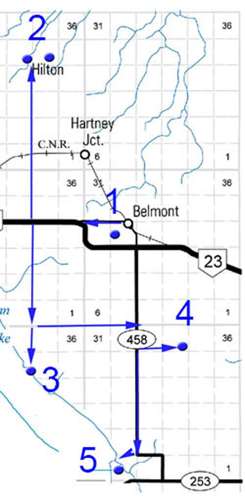 ![]() Belmont & Area Self-Guided Tour #1 (Town) Self-Guided Tour #2 (Rural) ![]() 1. The Railway ![]() ![]() In 1889 the Northern Pacific and the Manitoba Railway began to build a branch line to serve the district from Morris to Brandon. A town site was chosen on a quarter section owned by Mr. John O. Bell. The land was purchased from Mr. Bell and in deference to this early pioneer, the town was named Bell's Mount. Belmont was made a divisional point in 1899. A coal dock, water tank, depot with living quarters for the station agent, section house and roundhouse were all built that year. At that time there were approximately thirty-five railway men employed in Belmont. An elevator, purchased by United Grain Growers from Canadian Consolidated Grain in 1959 was destroyed by fire on 18 April 1973. Rebuilt as a 109,000-bushel elevator and crib annex in 1974, it was closed permanently in January 1999 and demolished in October 2000. The old rail bed, running east of George Street was once the home to the station, elevators, water tower and roundhouse. It is now the Strathcona Trail, running all the way to Ninette. 2. Schools ![]() The first school district in the region, named Craigilea, was formed in 1886. The schoolhouse was moved onto the new town site of Belmont in 1890, and a four-roomed brick school was opened in 1904. A monument marks the site 3. Former Presbyterian / United Church ![]() The Belmont United Church was built as a Presbyterian Church in 1901. Following Church Union in 1925 brick veneer was added. It closed in 1991 and is now privately owned. 4. Christ Church Anglican ![]() ![]() This Anglican Church was built in 1901. Inside is a stained glass window commemorating local veterans of the First World War. Now deconsecrated, the building is operated as part of the Belmont and District Museum. 5. The Belmont and District Historical Museum ![]() The museum is operated by the Belmont and District Historical Society. The railway caboose across the street is a part of the museum collections, along with printing equipment from the former Belmont News, medical equipment from the late Dr. Stevenson, military uniforms, and other artifacts. 6. The Sports Grounds & Arena ![]() The Belmont Recreation Centre was built in 1974 by volunteer labour. The Belmont A Team In the summer of 1951, the Belmont A team was first organized into Official League Baseball. That year the team succeeded in getting into the finals of the Central Manitoba playdowns. 7. The Former Belmont News Building ![]() ![]() The first Belmont News arrived in 1903 and it was published until 1988. It was one of the last newspapers in Canada to publish using the traditional letter press and hot metal method. The local museum has an excellent display of the equipment they used. 8. The War Memorial ![]() ![]() This monument was erected in 2005 to commemorate people from the local area who have served in military conflicts. 9. The Bank of Montreal Building ![]() ![]() Belmont's first three bank buildings were destroyed by fire before this structure was built in 1941. 10. Main Street ![]() ![]() 11. The Hotel ![]() ![]() The Venice Hotel ![]() The “Trafalgar" on Third and George Streets was one of the best hotels in southern Manitoba, containing thirty-one rooms. This hotel had its own lighting plant, which also supplied power to the other businesses up the street. In 1919 it was destroyed by fire, and replaced by "The Venice Hotel". In 1970 The Belmont Motor Hotel was built on the foundations of the Venice Hotel. Self-Guided Tour #2 Belmont