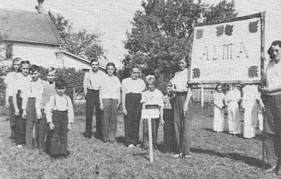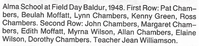 Belmont and Area / 4. Alma School ![]() The School District of Alma, Number 668, was incorporated in 1889. The school, on land donated by Mr. Louis Cline Sr., was built with volunteer labor. The first classes were held in 1890. The first teacher, Mr. Alex Tumoth, asked the students for suggestions for a name, and the name "Alma" was chosen. In 1905, a new brick building, complete with bell tower, replaced the old school Alma School was closed in 1960 ![]() ![]() ![]() ![]() |