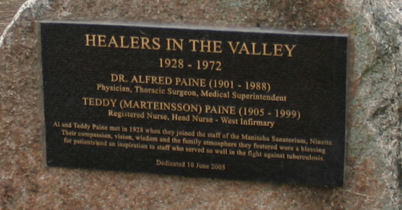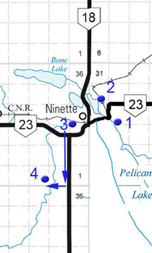 ![]() Ninette & Area Self-Guided Tour #3 (Town) Self-Guided Tour #4 (Rural) Ninette The Railway Story ![]() A walk down the Main Street… Begin your tour of downtown Ninette at the intersection of Highway 23 and 18. If you look eastward you can see the rail bed. If you’re up for a walk – go east to the Strathcona Trail. On the west side of the street, at the corner, you see the former Overend Store. ![]() The Railway Story The Northern Pacific and Manitoba Railway arrived in 1899, creating the current village. The station and elevators became the lifeblood of the community. The first Grain Elevator was the Winnipeg Grain Co. (1900) followed by the Northern Elevator Co. (1903) and the Patterson Elevator (ca.1919). Patterson’s was sold to the Manitoba Pool Elevator Co. in 1928. Walking eastward you will pass the former Overend Store. The Overend Store ![]() Built in 1908, this building was in continuous use as a store until recently. James Overend was the first owner. The railway line crossed Highway 23 just to the north. The elevators and station were to the west on the other side of the tracks The Post Office Building ![]() ![]() The first Ninette Post Office was located on the homestead of Thomas Colpitts in 1884. This building was built by Postmaster James Overend in 1911 and served until 1959. Overend Hall ![]() The hall was built in 1905 on the west side of Queens Street. The Legion bought the building and moved it to the east side in 1954. As you may have noticed, the Overend family were prominent in the early history of the region. War Memorial ![]() The Cenotaph was originally erected on Riverside Street and moved to the Hall after the Legion took it over. On the west side of town.... The School The Ninette School District was organized in 1899 and, for a time, students attended classes above a general store. In 1901, a one-story, one-classroom school building was erected around 1912. ![]() This red brick structure was built in 1926. ![]() The school closed in June 2007. The school building has been renovated into a private residence. St. Michael's Anglican Church ![]() Beginning in 1903, Anglican services were held in the village school and soon the congregation began fundraising for this building. St. Andrew's United Church ![]() The United Church was build as a Presbyterian Church in 1908. At first the Church was used by Methodists as well. The two joined long before Church Union in 1925. The Pelican Lake Yacht Club If you follow the Main Street south towards the lake you come to the Yacht Club and Terry Fox Park. ![]() The Club was founded in 1965. The former Pelican Lake School was moved to the site in 1968 as a clubhouse. Terry Fox Park ![]() The Cairn, dedicated in 2004, tells the story of Terry Fox, whose maternal grandparents were from Ninette. Terry spent several summers here, and was baptized in the United Church Manse. The Ninette Motor Hotel Ninette’s first hotel was built in 1906. It was called the Christie Hotel. In about 1964 the Ninette Motor Hotel was opened. Self-Guided Tour #4 Ninette Rural Sites.... ![]() 1. The Sanatorioum As you approach Ninette from the east along Highway #23, the first thing you will notice is the panoramic view. On the south side of the Highway is the former Ninette Sanatorium. ![]() Aerial view of the Ninette Sanatorium site (July 2019). Source: George Penner. \Just off of the Highway to the north is the attractively situated “Healers In The Valley” Monument commemorating the work of Dr. Alfred Paine and his wife, Teddy Paine, a Registered Nurse. The former San buildings are across the highway to the south. The Sanatorium Board of Manitoba operated several tuberculosis sanitoria in Manitoba from the early 1900s until the 1960s. The facility was largest sanatorium in the province, comprising over a dozen buildings. The facility closed in 1972. From 1973 to 2000, it operated as the Pelican Lake Training Centre, then as a Christian conference centre and retreat. A monument near the former administration building commemorates Dr. Stewart, the first Superintendent of the facility. He is also noted on a historical marker erected at the site by the Historic Sites Advisory Board of Manitoba. ![]() 2. The Strathcona Trail ![]() On Highway #23, to the north you might catch a glimpse of the abandoned railway bridge that is now part of the Strathcona Trail. The trail climbs gently out of the valley. Railways avoided steep grades. ![]() The Ninette Cemetery As you exit town to the south along Highway #23&18, across from the Ninette Motor Hotel you can leave the highway to the right and take a scenic gravel road up the hill to the Cemetery. (It is also accessible from the first right turn as the highway crests the hill. ![]() The land for the Cemetery was sold by Charles Overend for $1 in 1922, but the first recorded burial there was in 1916. Other earlier burial involved graves moved from other locations. Records are missing because the safe containing them was stolen and the contents destroyed. Some patients from the Ninette Sanatorium were buried here. N 49.39886, W 99.64244 Knox Presbyterian Church - Bellafield ![]() Knox Bellafield Presbyterian Church is situated roughly in the middle of what used to be known as the Crofter Settlement. Once known locally as the Gaelic Church, is a direct link to a group of Gaelic-speaking families, settlers from the Isles of Lewis and Harris in the Western Isles of Scotland. N 49.35709, W 99.67603 The Bellafield School was nearby along Highway #18. It was opened in 1884. N 49.35471, W 99.65203 ![]() Tours in Belmont & Area Tours in Dunrea & Area |