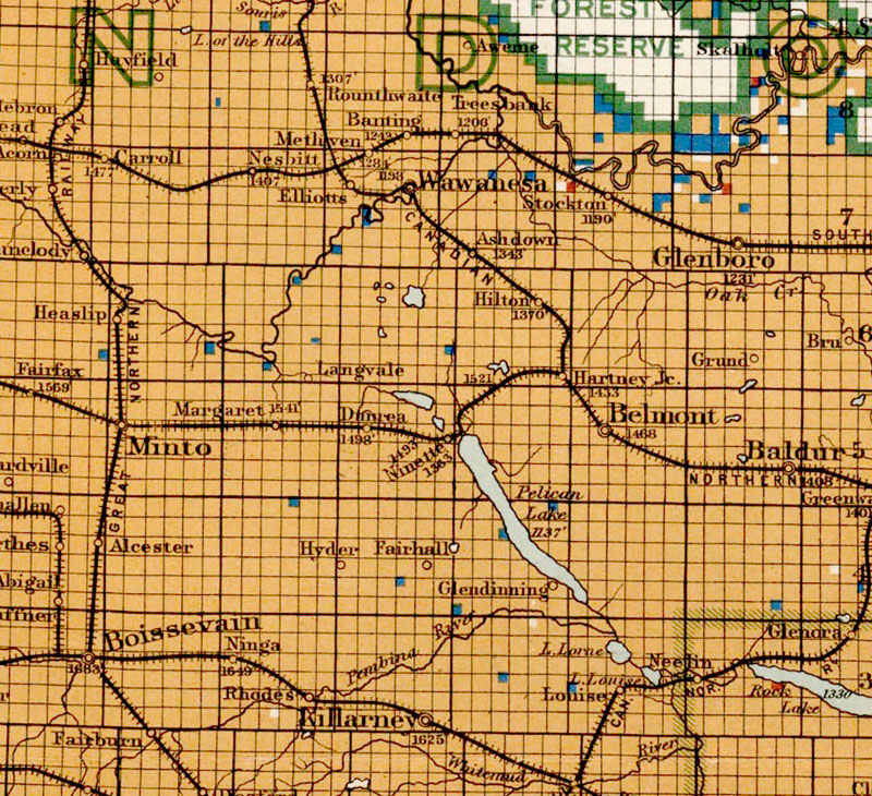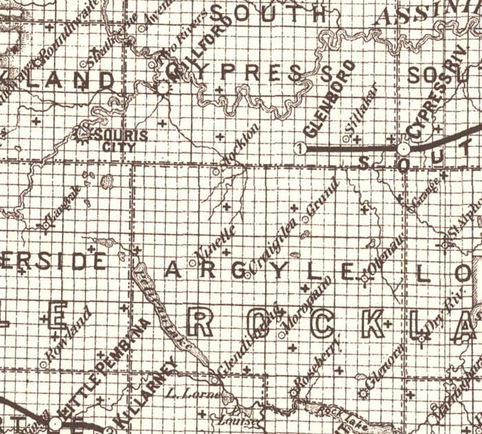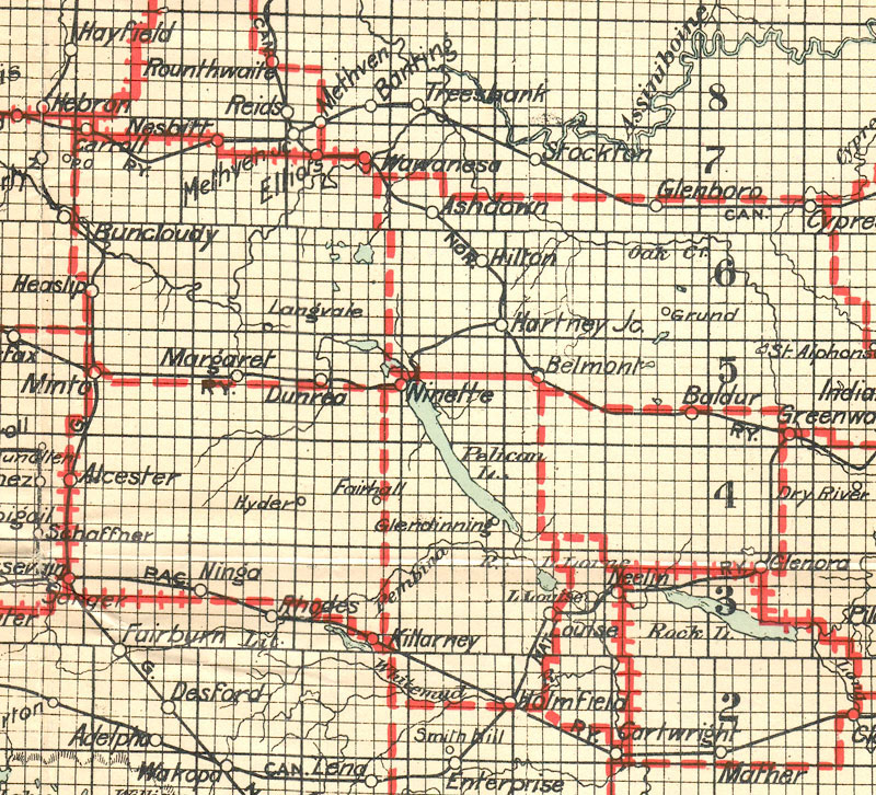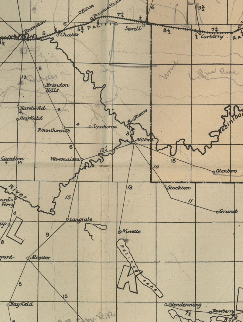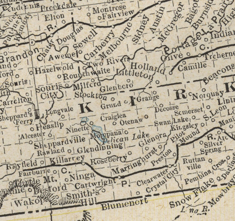 ![]() Map Archive 1. Tracing the changes in our region. 2. Cummins Rural Directory Maps - 1923 3. Selected Topical Maps 1. Tracing the changes in our region ![]() 1790 Fort Epinette (Pine Fort) was located north of Glenboro. Rib Lake is Rock Lake. Rib River is the Pembina. ![]() 1825 The Souris River was also called the Sandfly. The locations of Pine Fort and Fort Brandon are incorrectly reversed. The "Fact" noted above Fort Brandon stands for Factory, as the Fur Trade Posts were sometimes called. It was located at the crossing near the Brandon Rapids. The Rapid River we know as the Little Saskatchewan. The city of Brandon would be located about midway between the mouth of the Little Saskatchewan and the Rapids. ![]() 1877 This map shows the extent of the survey in 1877. It had almost reached Prairie Lakes. ![]() 1882 The Land Office at Souris Mouth was where homesteaders heading towards the Pelican Lake region would register their claim. Many early settlers came by steamboat to that point and could get provisions at the nearby village of Millford. ![]() Postal Routes - 1884 The Post Office at Craiglea opened in 1884 but didn't make it onto this map. ![]() Mail to the area now known as Prairie Lakes came by way of Millford. ![]() 1887 Post Offices and the beginning of Railway Service. ![]() 1887 ![]() 1900 Railway service is in place. ![]() 1912 ![]() 1915 ![]() 1926 Highways began appearing on maps in the mid 1920's. ![]() 1956 2. Cummins Rural Directory Maps - 1923 ![]() Moving east to west.... ![]() ![]() ![]() ![]() Download a pdf of the full map for Prairie Lakes... View the full Cummins Rural Directory 3. Topical Maps ![]() ![]() ![]() Lang's Crossing |