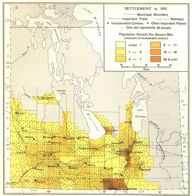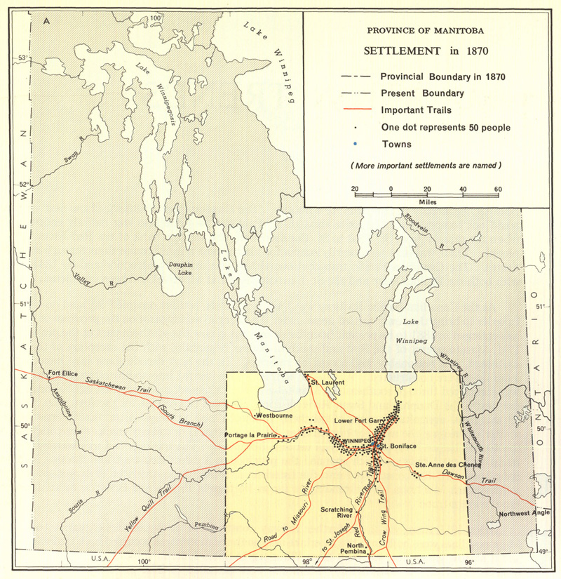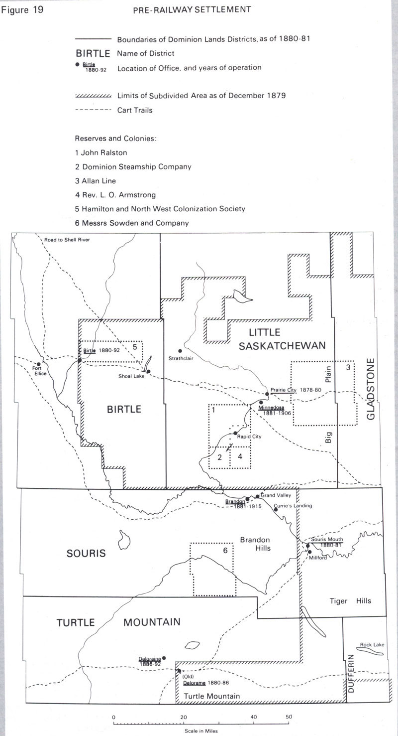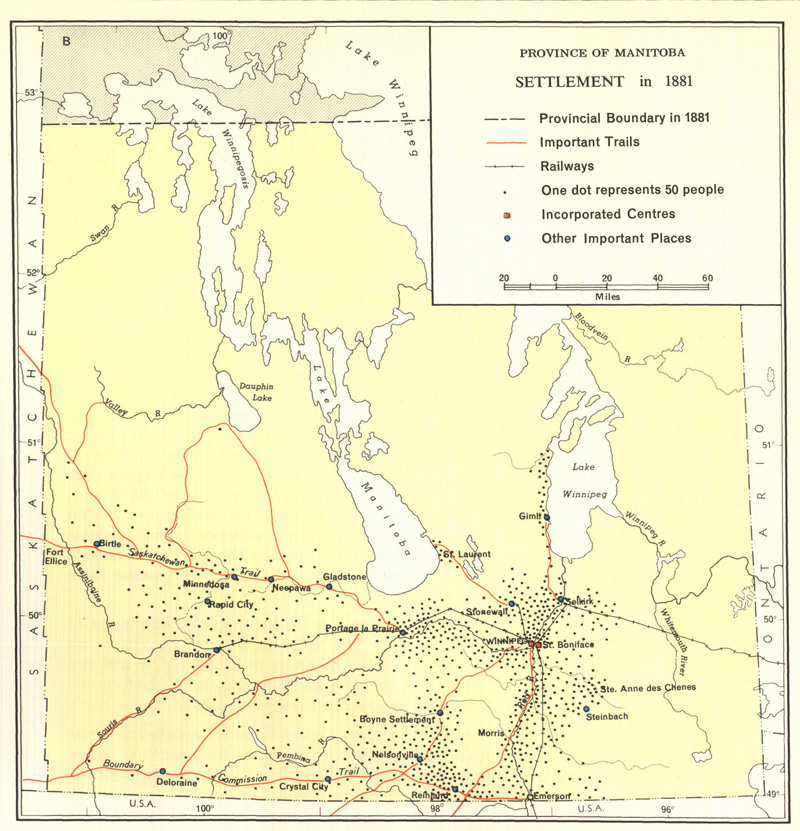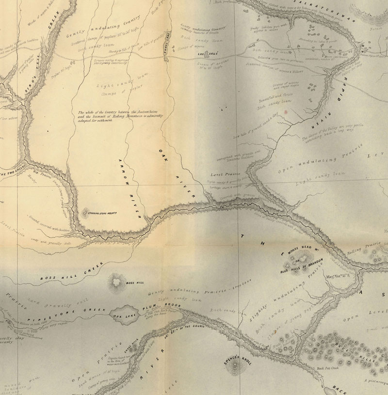 ![]() Map Collection: Settlement Theme S1. Hind 1859 ![]() Hind 1859 http://www.flickr.com/photos/manitobamaps/3808734146/ Map of a Portion of Rupert's Land Surveyed and Examined by the Assinniboine & Saskatchewan Exploring Expedition in the Year 1858 [Sheet 3] (1859) Hind, Henry Youle. Map of a Portion of Rupert's Land Surveyed and Examined by the Assinniboine & Saskatchewan Exploring Expedition in the Year 1858 Under Instructions from the Provincial Secretary Canada [Sheet 3] [map]. 1:443,520. In: Henry Youle Hind. North-West Territory Reports of Progress Together with a Preliminary and General Report on the Assiniboine and Saskatchewan Exploring Expedition Made Under Instructions from the Provincial Secretary Canada. Toronto: John Lovell, 1859. Henry Y. Hind in charge fo the Expedition. James A. Dickinson, Surveyor & Engineer. John Fleming, Assist Surveyor & Draughtsman. Engraved by Maclear & Co. Lith. Toronto. The dotted lines shew those parts not not actually surveyed by the Expedition, some being taken from Thompson's Map, such as the East Coast of Lake Winnipeg & the Northern portion of Lake Winnipegosis and some information obtained in the Country. The continous lines shew those portions of the Country which were actually surveyed. The original maps are on two large sheets and as a result of scanner size constraints they have been scanned in four sections with overlap for display online. Both H. Y. Hind and S.J. Dawson prepared vast maps showing the accomplishments of their explorations, and one of the most interesting features of these maps is the manner in which relief is depicted. Hind used hachures to show Riding Mountain, and the technique is very appropriate for that purpose. The map also demonstrates how Hind’s observations were centred around field mapping, and how comprehensive was the data which he collected. Vegetation is mapping, sloughs are indicated in the till plain south of Riding Mountain, geological formations are marked, and cart trails are shown on the ridges so that one can see that they are used for travel. Soundings are shown along the west shore of Lake Winnipeg. Much topographic information is entered in the form of written comments and many of the observations, such as “Vast Level Prairie adapted for Agriculture”, were reproduced in countless maps to follow. The Portage Plains, destined to be one of Canada’s great agricultural districts, are designated “Rich Clay Loam”. A special terminology is occasionally used, as when the phrase “Oak Orchards” appears. (Warkentin and Ruggles. Historical Atlas of Manitoba. map 91, p. 220) Image Courtesy of University of Manitoba Archives & Special Collections Manitoba Historical Maps - Flickr Back to INDEX S2. Laurie's 1876 ![]() Laurie 1870 NWT http://www.flickr.com/photos/manitobamaps/2231443980/ Laurie’s Map of the North-West Territories (1870) Donald Codd emphasized the different ways of getting to Manitoba in this map of 1870. The routes from Lake Superior and St. Paul to Winnipeg are shown particularly well. The Dawson Route is correctly marked, even though it was not in operation until 1871, and the wagon road from Fort William to Lake Shebandowan is indicated. The St. Paul route is shown, along with a table of distances. Railroads are just being extended from St. Paul to Duluth, and from St. Paul to the Red River. Both points were reached during 1871, and also a direct line was being constructed in that year from Duluth to the Red River. The regular rectangular township survey which was in use in the United States, and was to be applied to Manitoba, can be seen in Minnesota. The map clearly reveals the later insertion of the name Manitobah brutally across the other features on the map. Codd has followed both Hind and Palliser as a source, and has fared better than Lionais in showing landforms; the Manitoba Escarpment is well done. (Warkentin and Ruggles. Historical Atlas of Manitoba. map 95, p. 240) ----------------- Laurie’s Map of the North-West Territories Shewing the Surveys now made, and the Railway and other Routes thereto. Compiled by D. Codd, Ottawa. 1870. Scale 1 inch to 25 miles. Lithographed by Roberts, Reinhold & Co., Lith., Montreal. Manitoba Historical Maps - Flickr Back to INDEX S3. Palliser Map 1859 ![]() Palliser Map http://www.flickr.com/photos/manitobamaps/2211818555/ A Section of a General Map of the Routes in British North America Explored by the Expedition Under Captain Palliser (1865) The final map in Palliser’s Report is one of the most visually attractive and most significant maps ever published of the area From Lake Superior to the Pacific Ocean. Material from it was often incorporated in other maps in future years. A very clearly conceived map, it is carefully organized, coping gracefully and seemingly effortlessly with a tremendous amount of information. Perhaps a considerable part of the credit for this map should go to Stanford’s Geographical Establishment, which produce it. The map shows the gross natural patterns of the interior extraordinarily effectively. The three prairie steppes, and the great vegetation, climatic, and land capability divisions, including the Fertile Belt for which Palliser is so famous, are all clearly delineated. Many of the major relief features are exaggerated. Geologic features are usually mentioned in descriptive annotations printed on the body of the map, and there are also interpretive remarks such as the reference to the Ancient Lake bottom in the Red River Plain. Some cultural features are shown, the population of Fort Garry is given, and there are very many Place names. There are errors of location, amounting to over 10 miles in some instances, but by and large the main features are accurately enough related to one another so that one is not bothered by these mistakes. The map does tie together a tremendous amount of material on the West in an appealing format. It is truly a masterful example of the cartographer’s craft. (
