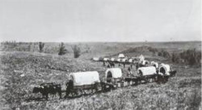 Trail, often in wagons drawn by oxen or horses, with whatever