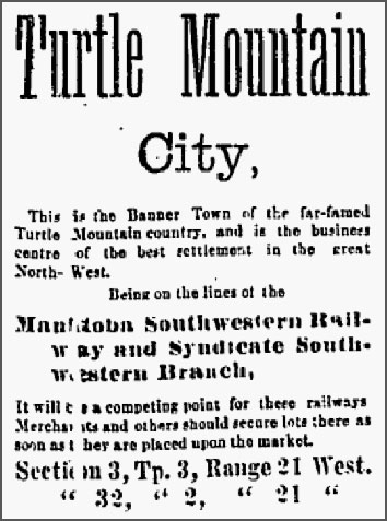 rail line was a sure thing. An ad for Turtle Mountain City, just a