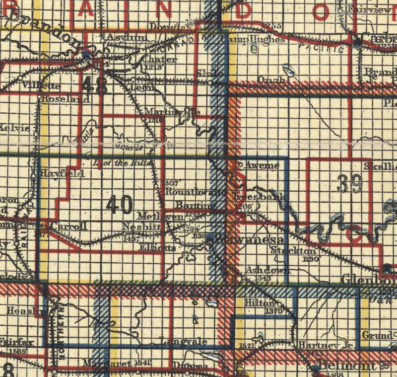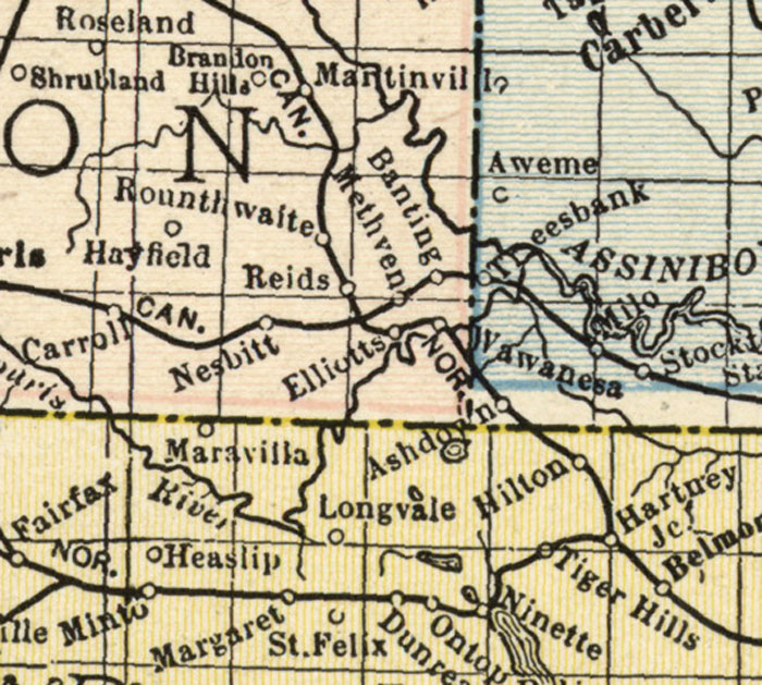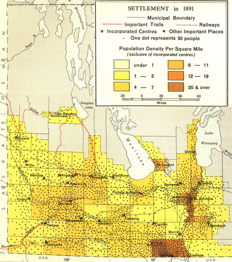 Maps / Settlement Palliser Map ![]() http://www.flickr.com/photos/manitobamaps/2211818555/ A Section of a General Map of the Routes in British North America Explored by the Expedition Under Captain Palliser (1865) (Warkentin and Ruggles. Historical Atlas of Manitoba. map 93, p. 224) ---------------- A General Map of the Routes in British North America Explored by the Expedition under Captain Palliser, During the Years 1857, 1858, 1859, 1860. Compiled from the Observations and Reports of Captain Palliser and his Officers, including the Maps constructed by Dr. Hector, and other authentic documents. 1865. ![]() S1. Hind 1859 http://www.flickr.com/photos/manitobamaps/3808734146/ Map of a Portion of Rupert's Land Surveyed and Examined by the Assinniboine & Saskatchewan Exploring Expedition in the Year 1858 [Sheet 3] (1859) (Warkentin and Ruggles. Historical Atlas of Manitoba. map 91, p. 220) Image Courtesy of University of Manitoba Archives & Special Collections Settlment 1870 ![]() These maps show the growth of population during the great settlement period of the late 19th and early 20th centuries. From 1870 to 1901 the population of Manitoba increased from 12,288 to 255,211. The influence of the rivers was still evident in 1870, but by 1881 farmers had leapfrogged the wet and sandy areas, were above the Escarpment and also moving up the Riding Mountain slope, and Icelanders were occupying the western shore of Lake Winnipeg. By 1891 the most favourable areas were settled, except for the Dauphin and Swan river areas which were only beginning to be taken up shortly before 1901. The fringe of agricultural settlement was being reached by that time, though in the next few decades settlers continued to move into the marginal lands of eastern and Interlake Manitoba. The maps also show clearly the expansion of the transportation facilities, particularly the development of the railroad network. ![]() Settlement - 1881 These maps show the growth of population during the great settlement period of the late 19th and early 20th centuries. From 1870 to 1901 the population of Manitoba increased from 12,288 to 255,211. The influence of the rivers was still evident in 1870, but by 1881 farmers had leapfrogged the wet and sandy areas, were above the Escarpment and also moving up the Riding Mountain slope, and Icelanders were occupying the western shore of Lake Winnipeg. By 1891 the most favourable areas were settled, except for the Dauphin and Swan river areas which were only beginning to be taken up shortly before 1901. The fringe of agricultural settlement was being reached by that time, though in the next few decades settlers continued to move into the marginal lands of eastern and Interlake Manitoba. The maps also show clearly the expansion of the transportation facilities, particularly the development of the railroad network. Weir, Thomas R. [Settlement 1870-1921] [map]. 1:3,041,280. In: Thomas R. Weir. Economic Atlas of Manitoba. Winnipeg: Manitoba Dept. of Industry and Commerce, 1960, pate 13. http://www.flickr.com/photos/manitobamaps/2129548738/ ![]() ![]() 1880's Stage Lines ![]() By Section, Township & Range, Studies in Prairie Settlement, John Langton Tyman. Brandon University, 1972, P39 ![]() http://www.flickr.com/photos/manitobamaps/3875351518/ Postal Map of Manitoba Shewing Post Offices and Mail Routes in Operation on 1st April 1884 (1884) Maingy, Le F. Ans. Postal Map of Manitoba Shewing Post Offices and Mail Routes in Operation on 1st April 1884 [map]. 1:570,340. [Ottawa]: Canada Post Office Department, 1884. Image Courtesy of University of Manitoba Archives & Special Collections ![]() Upham, 1890 ![]() Railway & Guide Map of Manitoba (1887) http://www.flickr.com/photos/manitobamaps/4139208350/in/photostream/ Brownlee, J. H. Railway & Guide Map of Manitoba [facsimile]. 1:760,320. Winnipeg: Manitoba Department of Agriculture, 1887. As reproduced by, Ottawa: Association of Canadian Map Libraries and Archives, ACMLA Facsimile Map Series #63, 1980. As settlement advanced in Manitoba local administrative units were established, and various kinds of units were tried before a satisfactory system was found. This map of 1887 shows the stage when municipalities were already in existence, but the boundaries of the much larger counties which had been the administrative units from 1880 until 1886 are still on the map.. (Warkentin and Ruggles. Historical Atlas of Manitoba. map 71, p. 180). ![]() Manitoba 1897 ![]() Map of Manitoba, British Columbia and the NorthWest Territo(ies (1897) http://www.flickr.com/photos/manitobamaps/4114634725/ Matthews-Northrup Co. Map of Manitoba, British Columbia and the NorthWest Territories [map]. 1:2,787,840. Buffalo: Matthews-Northrup Co., 1897. Image Courtesy of University of Manitoba Archives & Special Collections (Morris Block fonds, MSS 207, A.05-43) www.umanitoba.ca/libraries/units/archives/collections/com... ![]() Map of Manitoba (1900) http://www.flickr.com/photos/manitobamaps/2086270771/ Bulman Bros. & Co. Map of Manitoba Published by Authority of the Provincial Government Winnipeg, April, 1900 [map]. 1:760,320. Winnipeg: Manitoba Department of Agriculture and Immigration, 1900. ![]() Manitoba 1918 ![]() http://www.flickr.com/photos/manitobamaps/2828730480/ Scarborough’s Map of Manitoba Canada South Sheet (1918) Scarborough Company of Canada Ltd. [Scarborough’s Map of Manitoba Canada South Sheet] [map]. Scale not given. [Regina]: Scarborough Company of Canada Ltd., 1918. |
