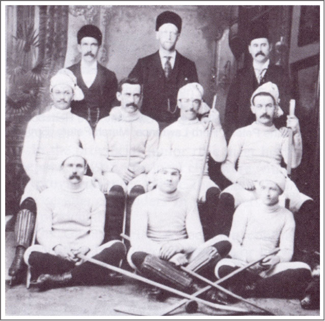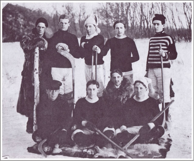 Hockey on the river around 1900. Back Row: Bob Corbett, Ralph