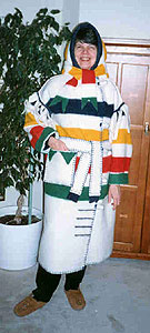 Ladies and gentlemen, you, too, have the opportunity to wrap yourself in history. Judith Hudson Beattie, Keeper of the Hudson's Bay Company Archives and several other men and women made HBC blanket capotes at workshops in the past two years. Judy enjoyed making her capote so much that she decided to make another one as a fundraiser for MHS. HBC donated the materials, and Judy did the hand sewing and blanket stitch trim (though without the buttons shown here), an estimated $600 value. The coat is medium-large. Its wrap-around style and dropped sleeves with cuffs accommodate a range of body types. Tickets ($2 each or three for $5) are available from MHS council and executive members or the MHS office until the draw, which will take place on June 11. All proceeds will go to support the Centennial Business Awards project of MHS.