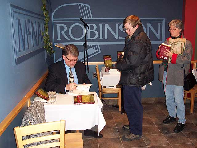 Jim Blanchard at the book launch on November 27 signs copies of Thousand Miles of Prairie at McNally Robinson Bookstore at Grant Park Mall. The book contains articles that appeared in MHS Transactions and introductory commentaries on them. |
