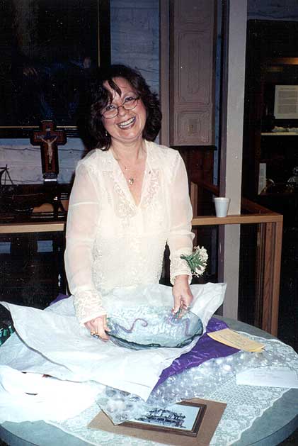 The occasion also recognized the efforts of Barb Howie who has been Dalnavert's Coordinator of Volunteers over the past thirteen years but who is retiring at the end of May. Mrs. Howie was presented with a hand-crafted glass bowl. She tells us that she plans to fill her time volunteering to assist AIDS patients.