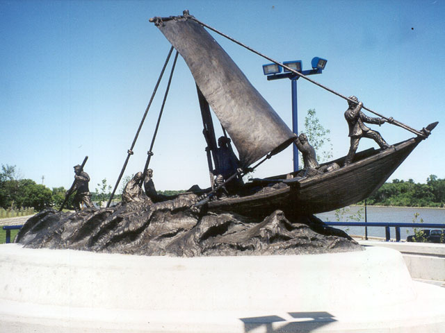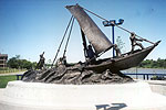 A massive bronze York boat in a concrete mooring is now the centrepiece of Selkirk's newly renovated waterfront. The 5500 pound statue created by Peter Sawatzky is 21 feet long by 10 feet wide and 11.5 feet high. It is made of 300 individual pieces of bronze fused together to form a hollow statue that depicts waves, the York boat, and its crew and cargo. The statue, commissioned by the city of Selkirk, was completed in time for the opening of Selkirk's refurbished waterfront on July 1. The waterfront will be the site of both the opening and closing ceremonies of the Western Canada Summer Games to be held from August 2 to August 10. |
