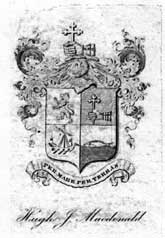 The bookplate used by Hugh John contains elements typical of the Clan Donald. It is composed of three separate components, the crest, the shield and the motto. The armoured hand above the shield is the Clan Donald crest. The shield contains images that are common to a number of Scottish coats-of-arms: the lion rampant, the armoured hand holding a cross, the ship and the fish. Some shields depict them in different orientations or different backgrounds. The motto at the bottom "Per mare per Terran" is commonly translated to read 'By water and By land.'