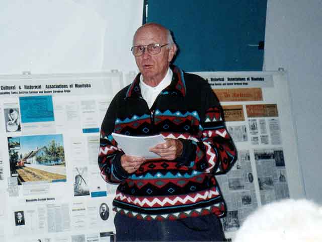Professor Dieter Roger speaks to joint meeting of MHS and German-Canadian Historical Association. Panels on display showed the contributions of German people to Manitoba.