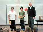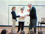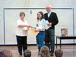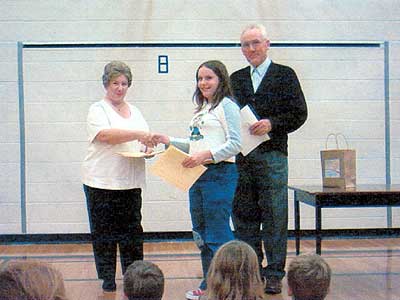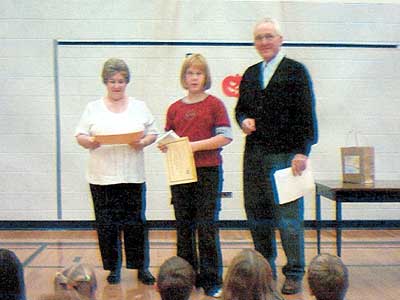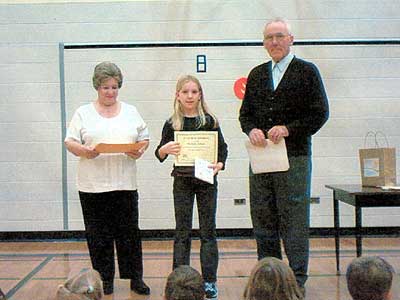 Young Historians 2003 Award winners from St. Francois Xavier Community School received special certificates and Canadian coin sets from the St. Francois Xavier Historical Society. Rudy Friesen and Jean Oucher presented the awards to Jennifer Friesen, Amy Guenther, Keri Guenther, Michaela Jochum, Kaylee Laramee, and Quillan Leclerc.