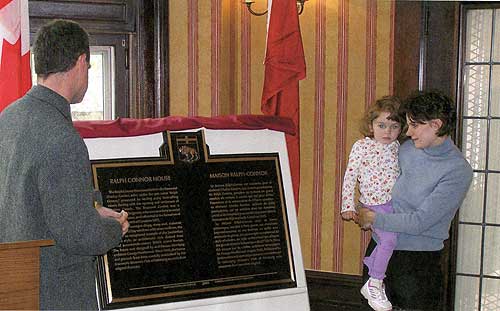 The above photo shows the unveiling of a Provincial Heritage Plaque on May 12, 2005 commemorating 54 West Gate as a building of provincial historic significance. Dr. James Allum, Chair of the Manitoba Heritage Council and Jennifer McFadyen, great granddaughter of Rev. Charles W. Gordon with her three-year old daughter Rachel