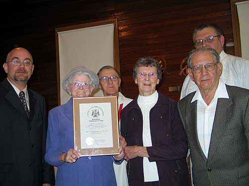 Holy Trinity Anglican Church (Miniota, Manitoba) members after the Centennial Organization Award presentation on 23 October. Left to right: MHS President Gordon Goldsborough, Hazel Wadham, Ed Wadham, Lil Horner, Bill Mossop, Rev. Tom Stradwick. Special thanks to Lynne Cornish who helped to organize the application and award ceremony.