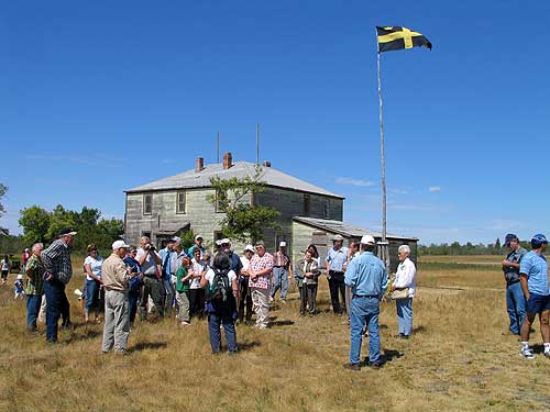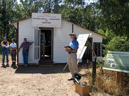 On August 13, there was a re-dedication ceremony for Norman Criddle’s entomological laboratory building at the Criddle-Vane homestead site near Carberry. The top photo shows a group having a tour of the site, standing in front of St. Albans, the home built in 1906. The family flag flies in the foreground. The bottom photo shows Dr. Neil Holliday of the University of Manitoba (who wrote the article about Norman Criddle in a recent issue of Manitoba History) on the right, speaking about Norman’s scientific legacy. The rebuilt laboratory building is in the background, along with some of the men who helped in its restoration.