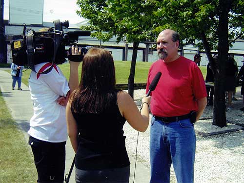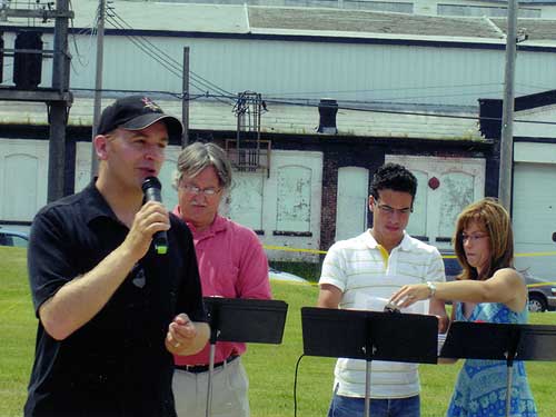 Following the unveiling of the plaque, some members of the cast of the musical “Strike” (about the Winnipeg General Strike of 1919), sang several numbers from that production, introduced by director and composer Danny Schur. The singers, Dana Horax, Taras Luchak and Marc Devigne, performed against the background of the former Vulcan Iron Works factory (across the street from Joe Zuken Park) which was one of the places where the workers went on strike.