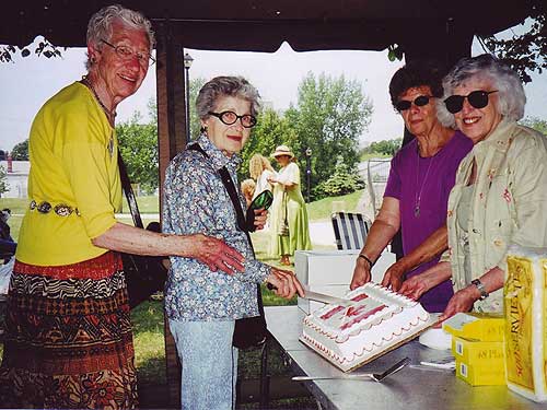 Bertha Arnold (left) and Clara Zuken (center) cutting cake.