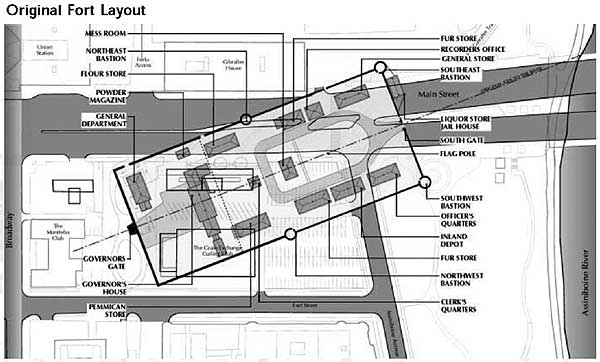 Extrapolating from preliminary archaeological work adjacent to the property under 100 Main Street, Peter Priess suggested in a Parks Canada Research Bulletin that “... It can be assumed that considerable archaeological resources exist at the site. The fort was large, had a large number of buildings and a lengthy history. All of these have left some physical signs of their existence in the ground. The presence of thick post occupation deposits ... is a positive feature ... because they provide protection for the structural and cultural remains below. The archaeology... must be done before development takes place.”